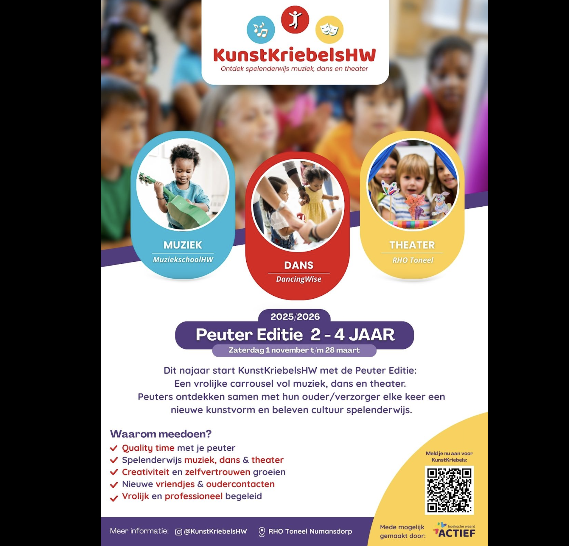Kunstkriebels is een bijzondere cursus voor kinderen van 2 tot 4 jaar. De cursus is ontstaan vanuit een samenwerking tussen RHO theater, Dancing Wise en Muziekschool Hoeksche Waard. Wat u kunt verwachten? Muzikaliteit, beweging, expressie en verbeelding in 1 serie van 15 lessen.