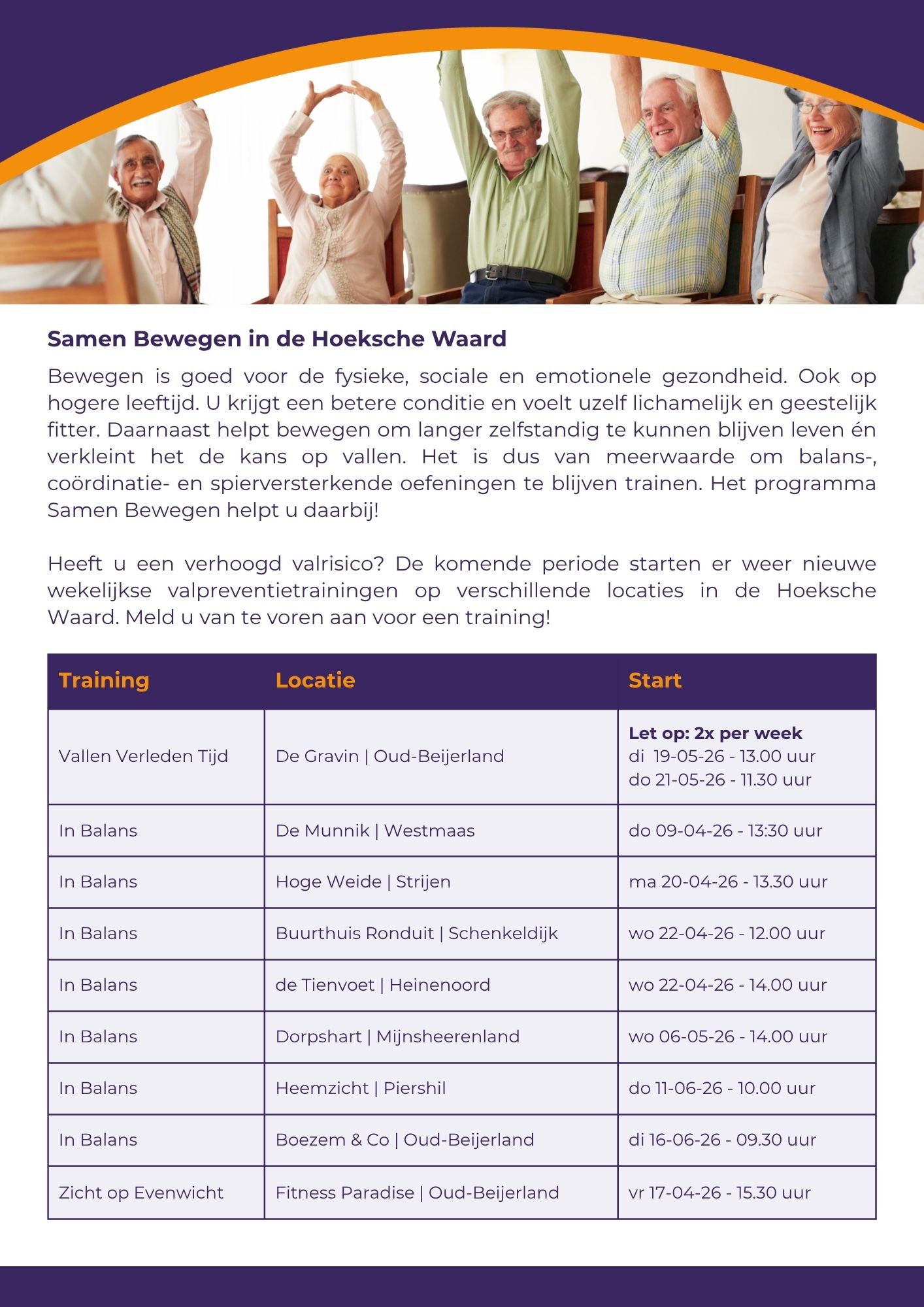 Vallen Verleden Tijd is een valpreventieprogramma voor thuiswonende ouderen van 65 jaar en ouder met een matig valrisico die 15 minuten kunnen lopen zonder loophulpmiddel. Tijdens Vallen Verleden Tijd gaat u in een groep, onder begeleiding van een professional, aan de slag met een valpreventieparcours, spelvormen en valtraining.